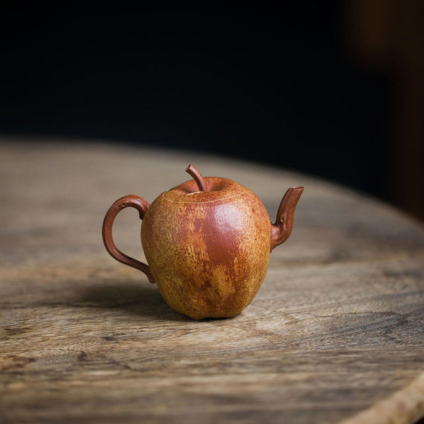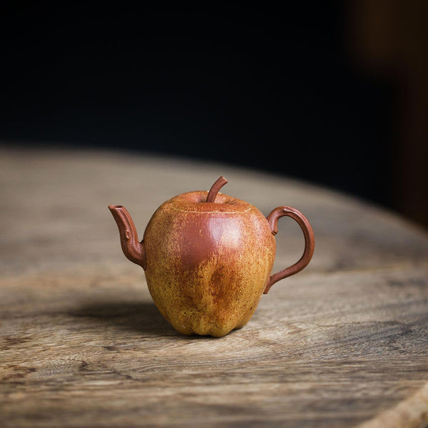 The teapot is designed as apple shape, the body is handmade with duanni, handle and spout are used jiang poni, outside of body is also decorated with jiang po ni. It looks vivid and interesting.
