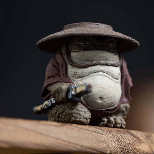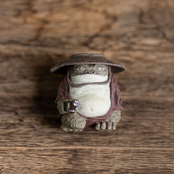 The Golden Toad Swordsman with a straw hat, presents an endearing appearance. It is not only a charming tea pet but also a practical lid holder.