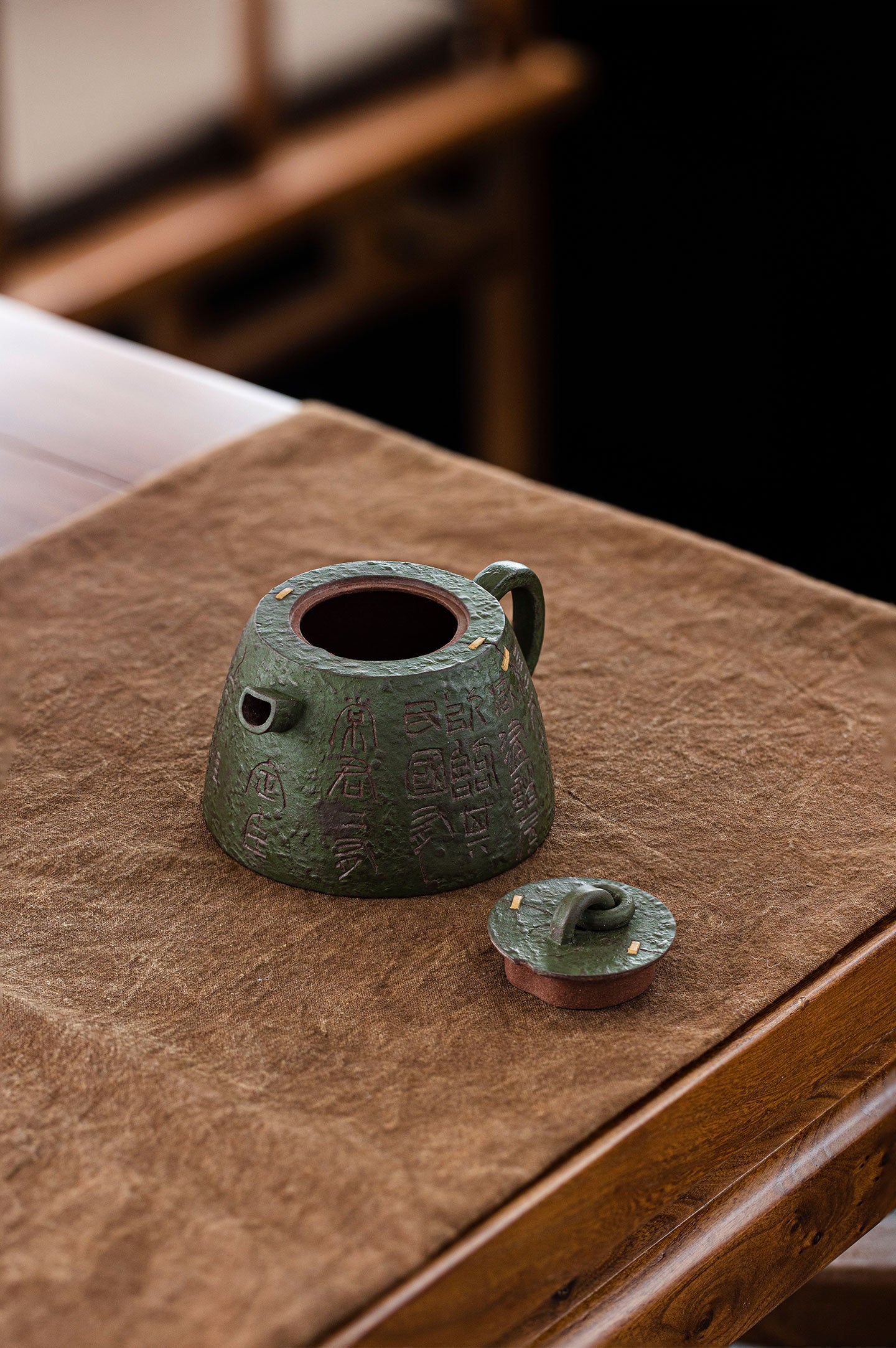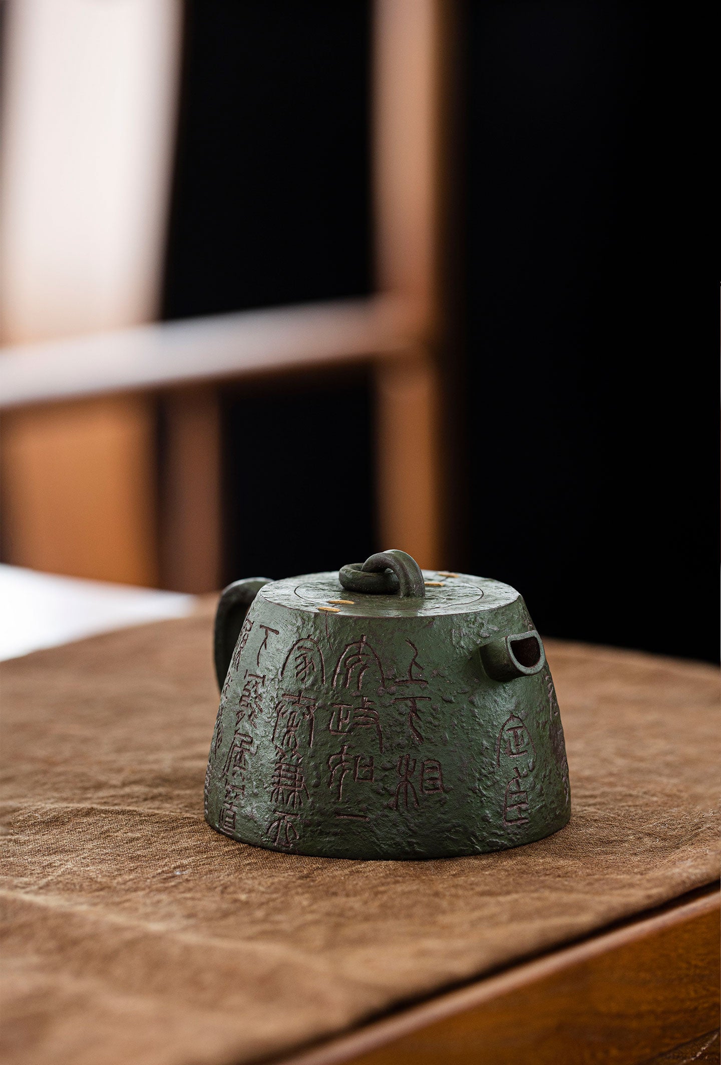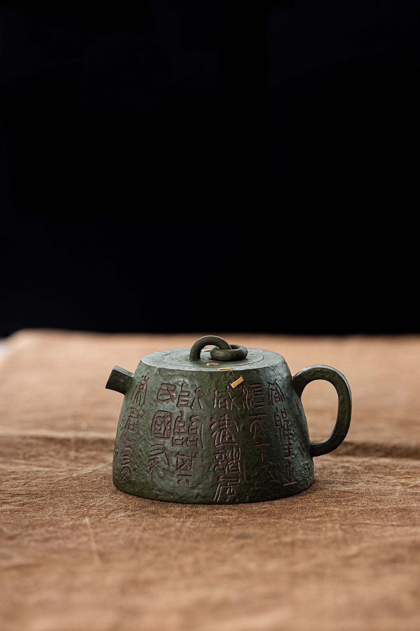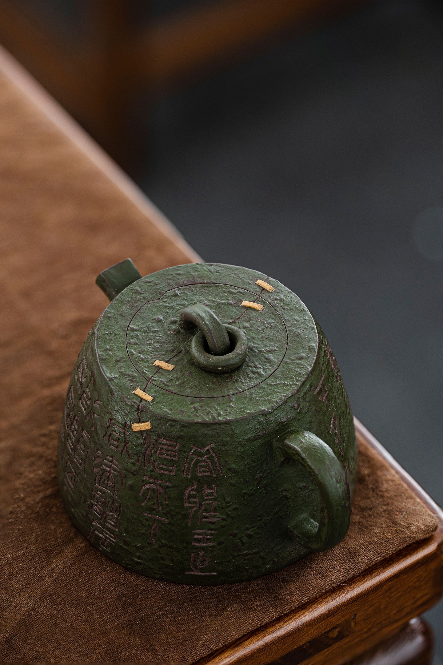 It was made by two kinds of clay(zini and lvni). Lvni is decorated outside the teapot. The textures and lines outside is so wonderful. Qin quan is symbol of rights and majesty. The artist also uses "锔钉" craft to decorate. It makes qin quan more ancient and special.