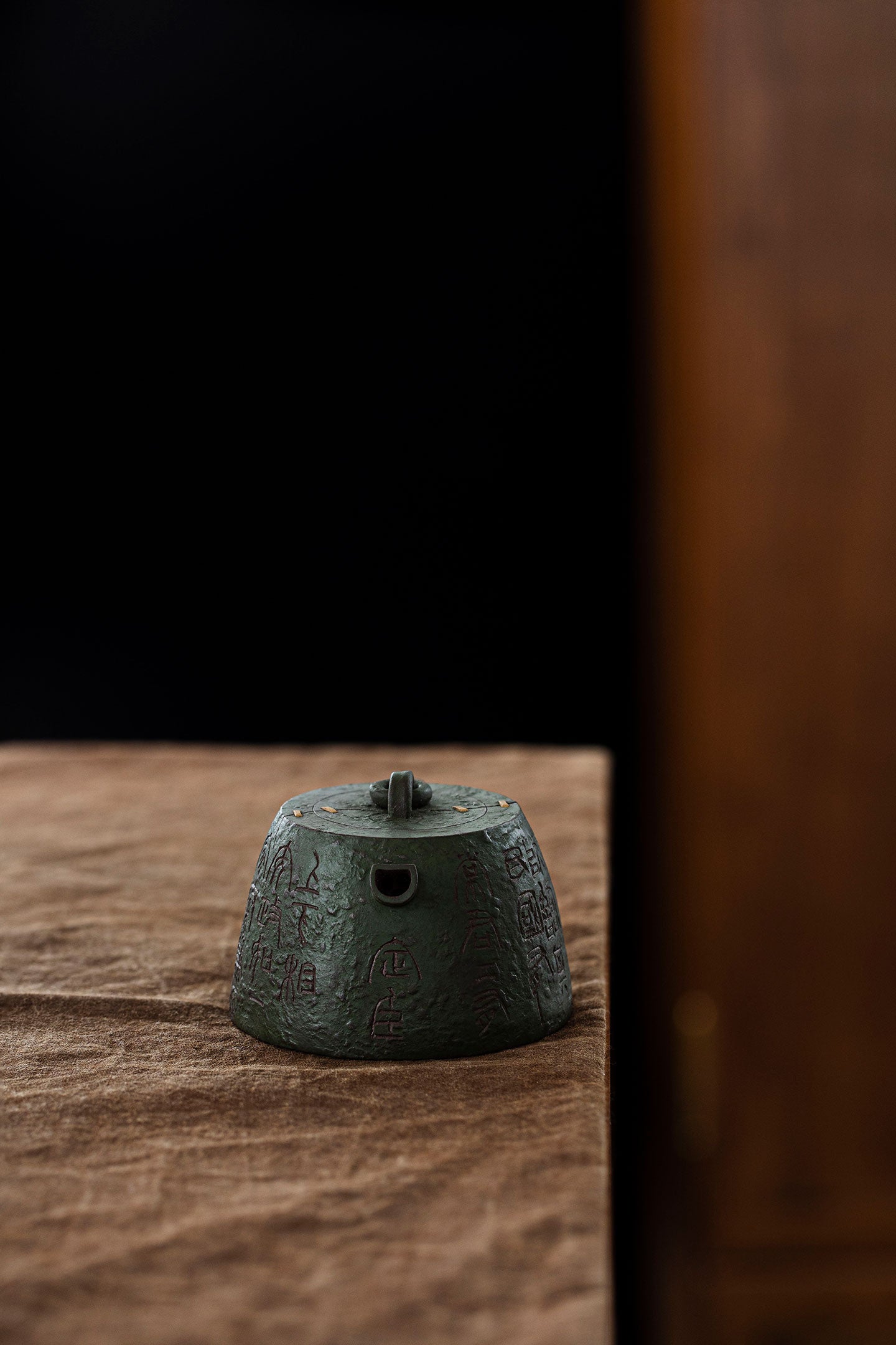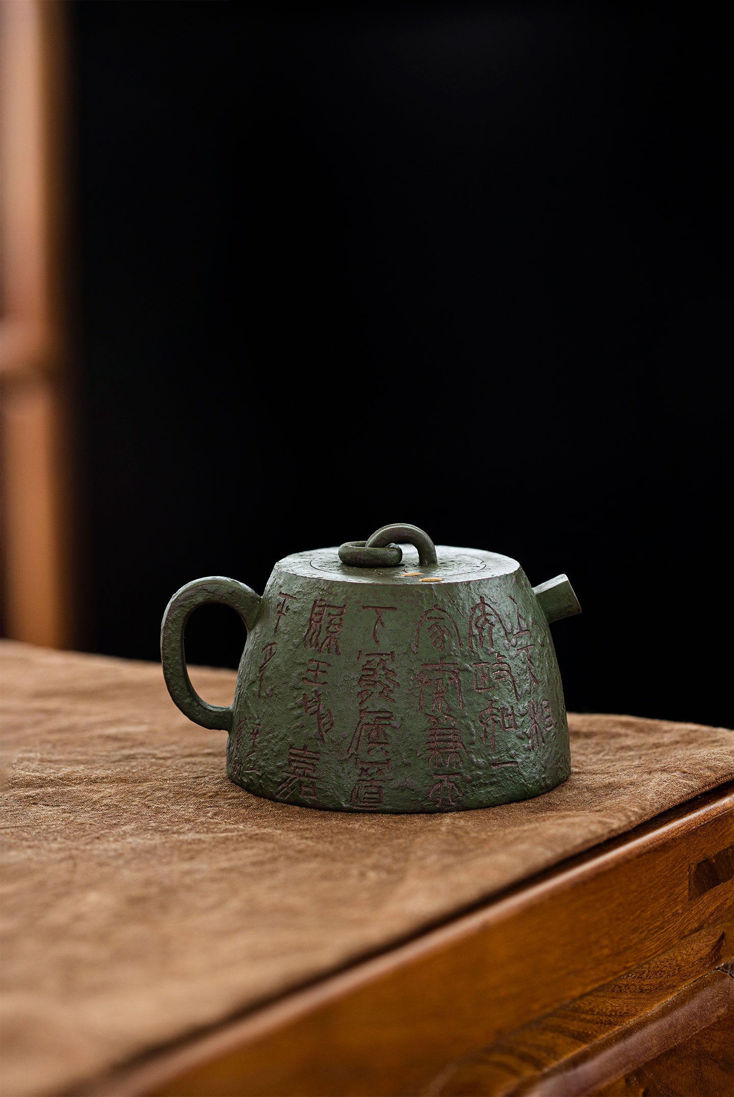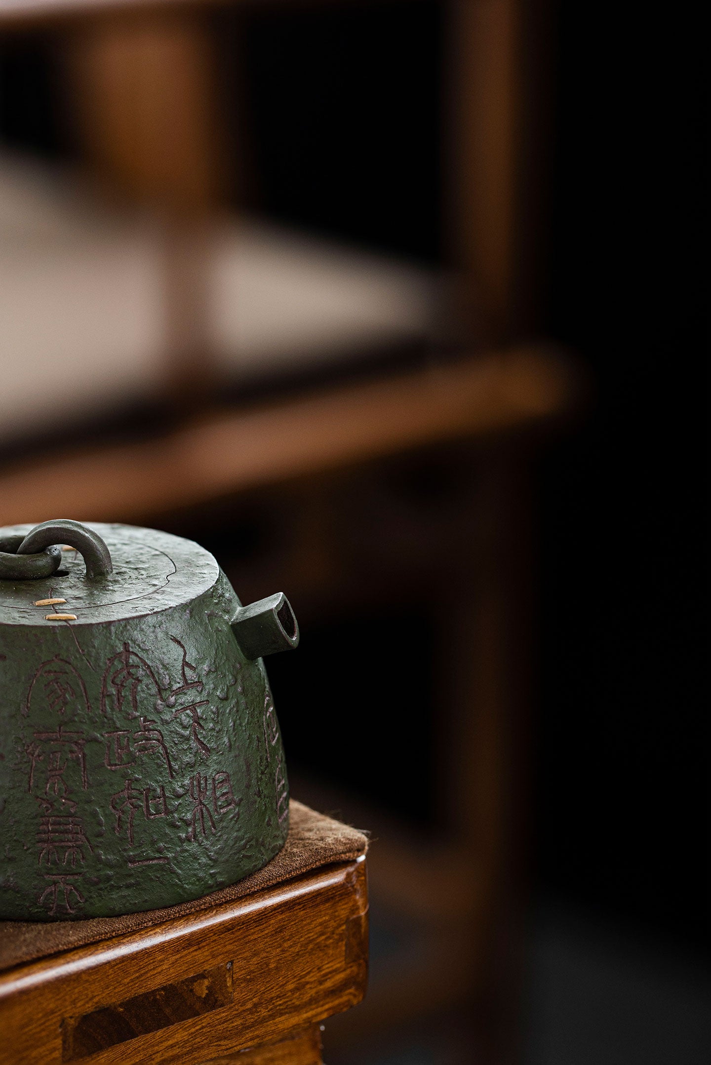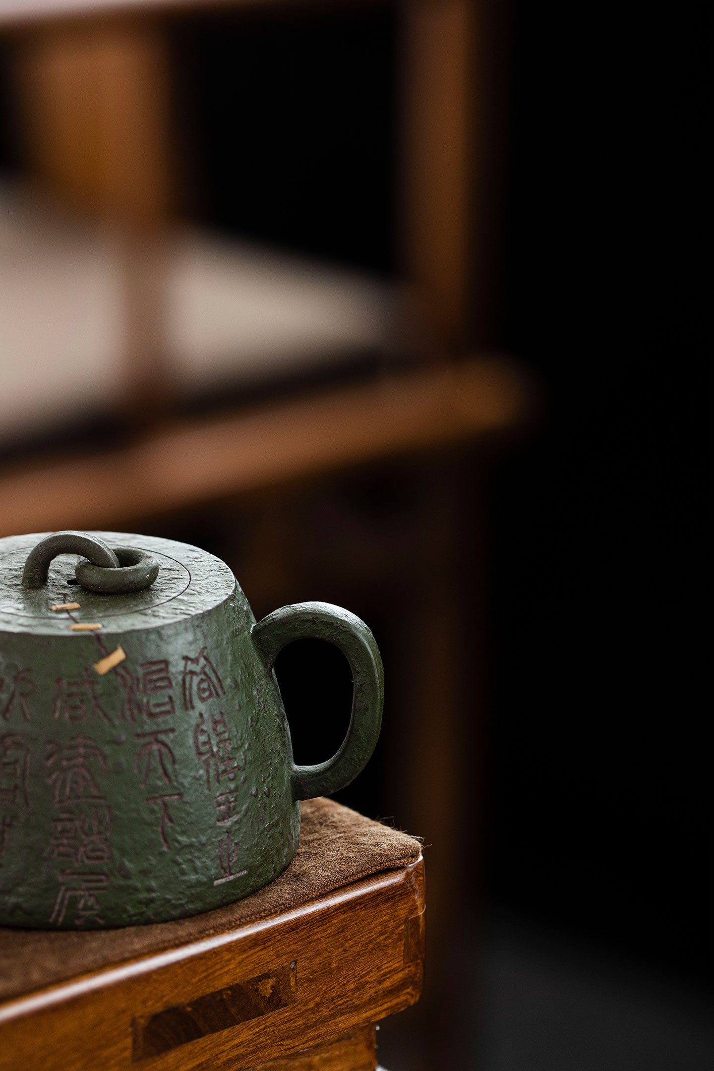 It was made by two kinds of clay(zini and lvni). Lvni is decorated outside the teapot. The textures and lines outside is so wonderful. Qin quan is symbol of rights and majesty. The artist also uses "锔钉" craft to decorate. It makes qin quan more ancient and special.