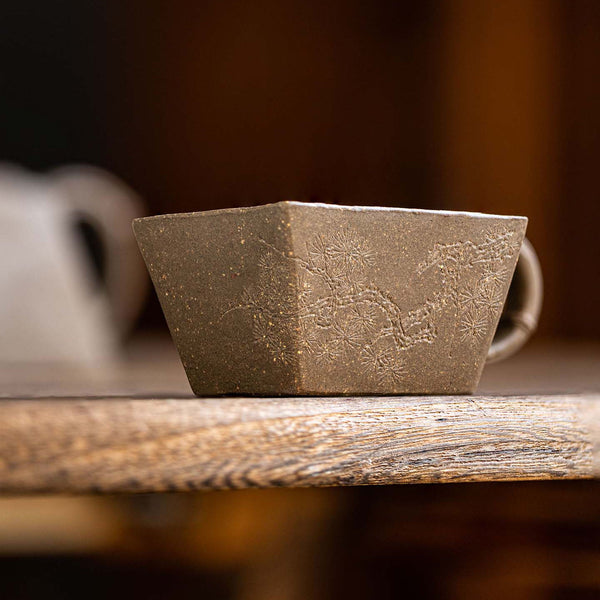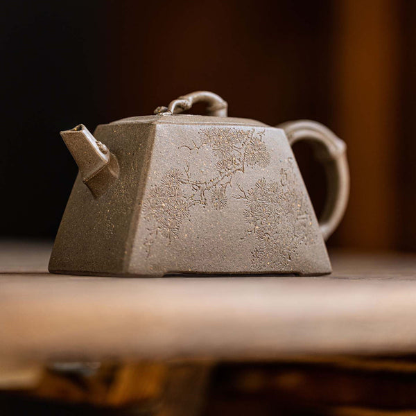 The bamboo style teapot is carved pine trees in details. The other side of body is carved letters"静以修身,俭以养德" that means Quietness cultivates one's character; frugality nurtures one's virtue.