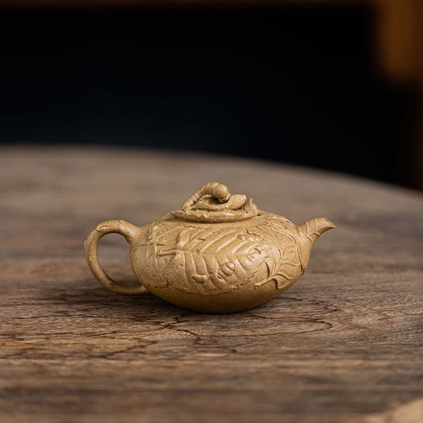 The teapot body is wrapped in mulberry leaves, with many baby silkworms feeding on them. It looks interesting and detailed.