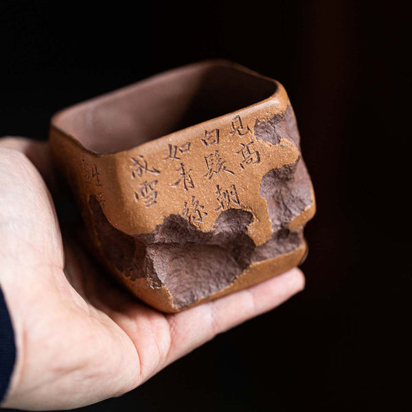 The teacup is designed as stony cliff, the surface is carved the poem"将进酒 -- 君不见,黄河之水天上来,奔流到海不复回。君不见,高堂明镜悲白发,朝如青丝暮成雪。人生得意须尽欢,莫使金樽空对月。天生我材必有用,千金散尽还复来。" that means Do you not see the Yellow River pouring down from heaven, Rushing to the sea and never to return? Do you not see, in the mirror of the high hall, The sorrow at white hair that at dawn was black as silk and by dusk has turned to snow?
